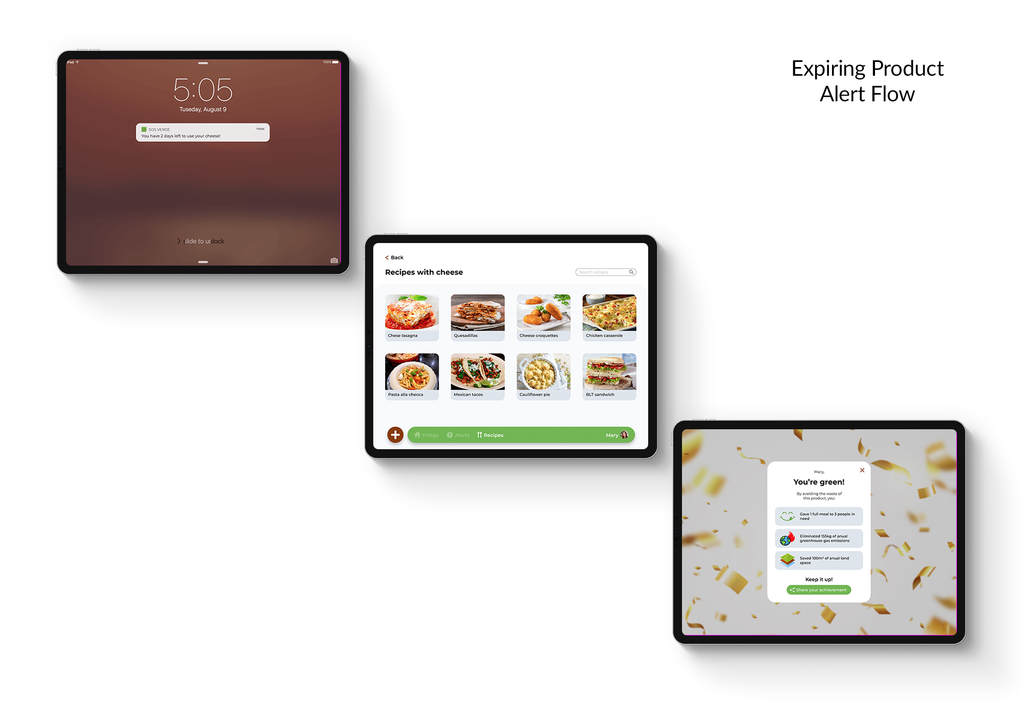 As time goes by and the users utilize the perishable foods in their kitchen, they can update their inventory. Sos Verde notifies users whenever one of their foods is about to expire and gives them different ways in which they can utilize the food so that it doesn’t go to waste. Whenever the users utilize a food that was about to expire, Sos Verde rewards them by telling them how they contributed to the environment by not letting that food go to waste. Users can furthermore earn and accumulate different awards that will keep them motivated to continue using Sos Verde.